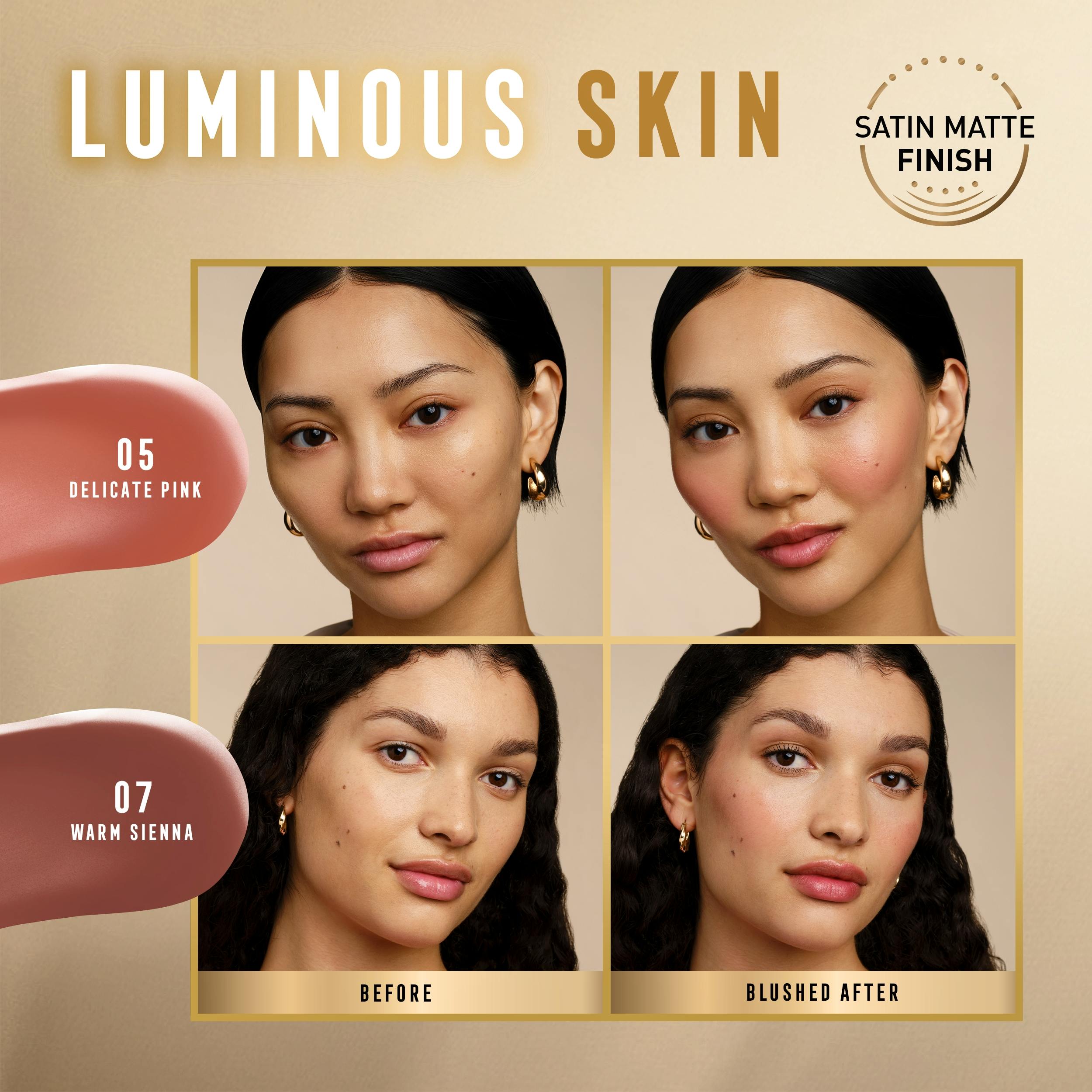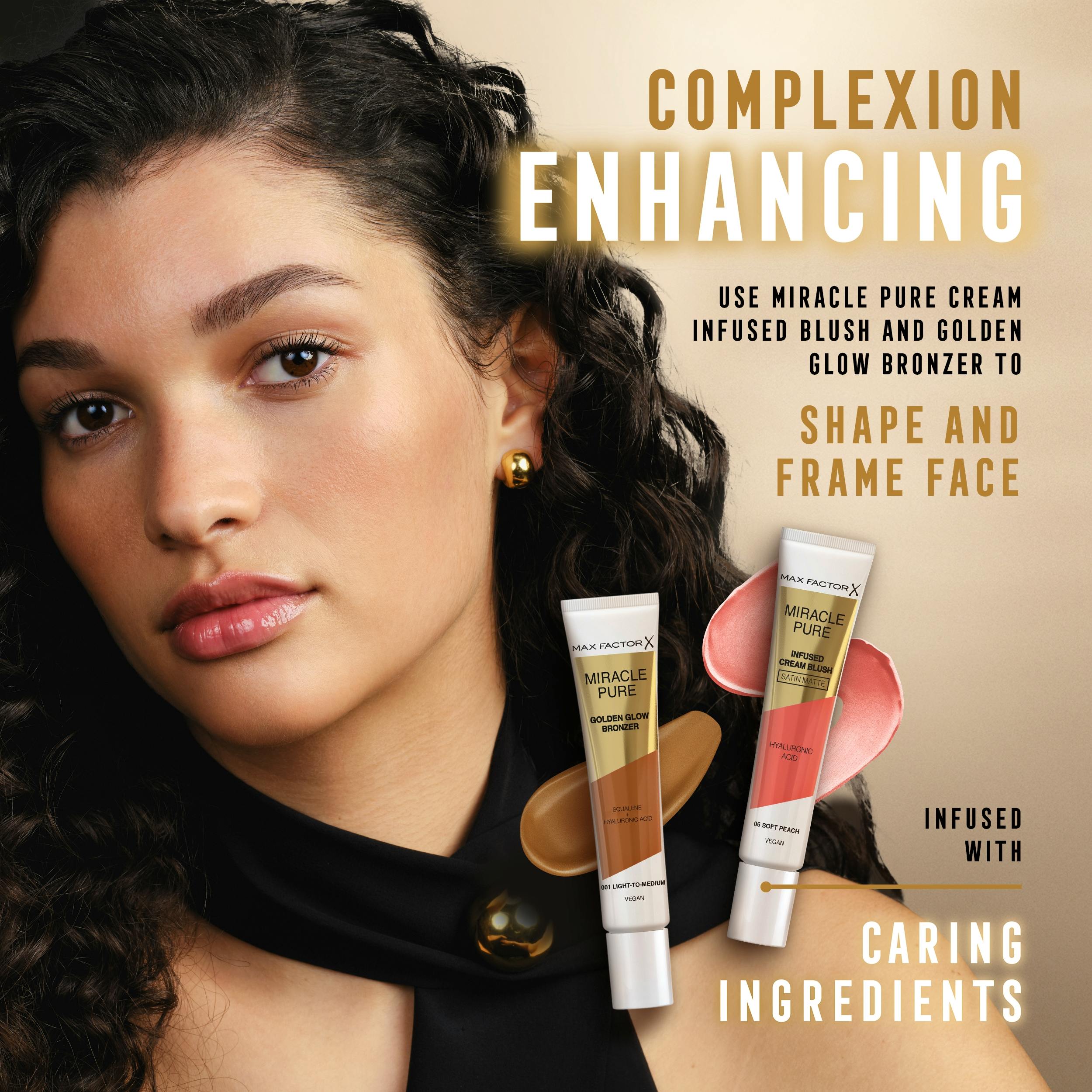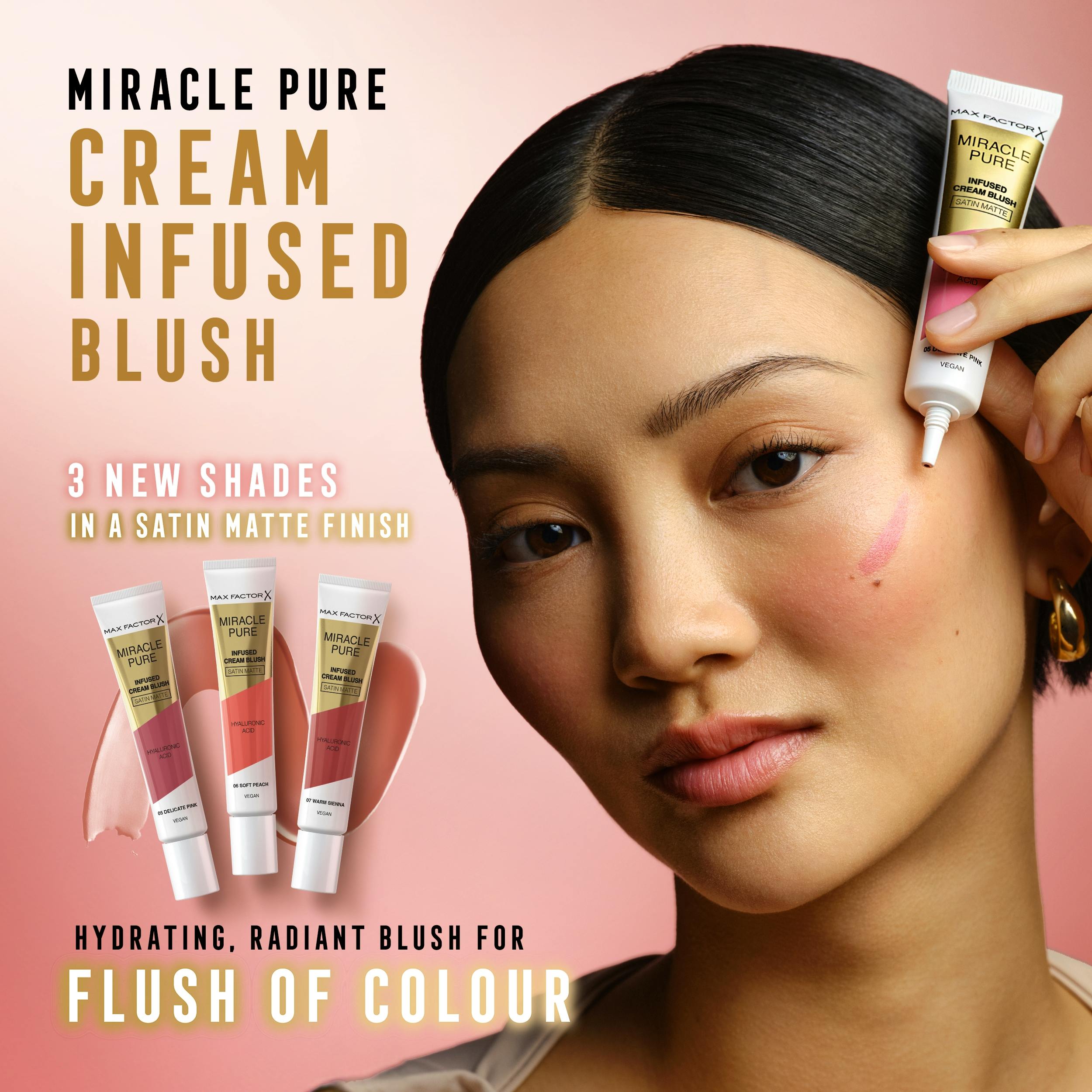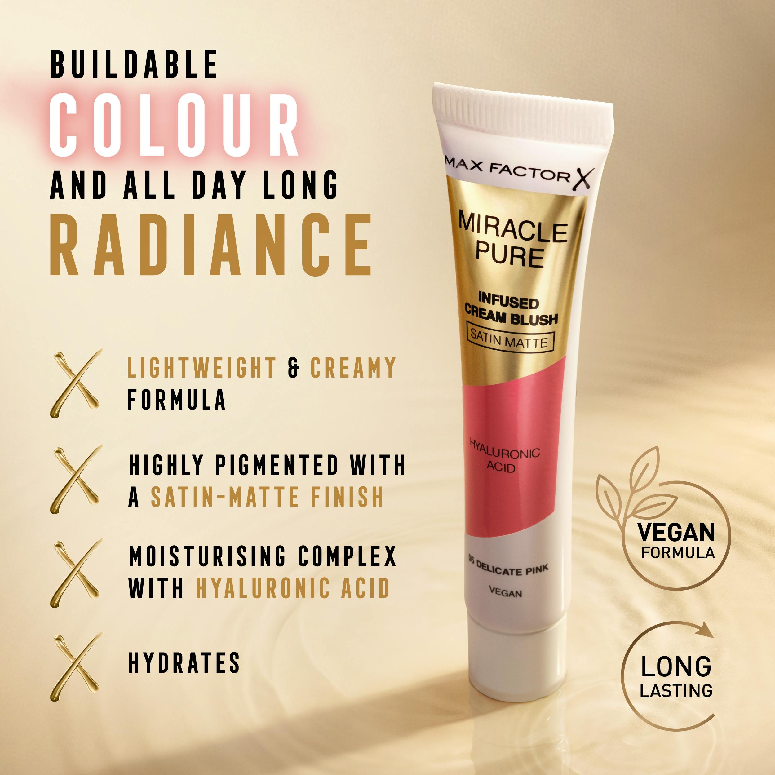 Max Factor's Miracle Pure Creme Blush in 05 Delicate Pink is een veelzijdig beautyproduct dat je natuurlijke teint verfraait met een gezonde, rozige gloed.