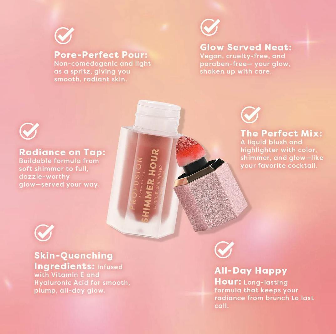 De Shimmer Hour Liquid Blushlighter Strawberry Mimosa van Profusion is een veelzijdig schoonheidsproduct dat de voordelen van een blush en een highlighter combineert in één handige vloeibare formule.