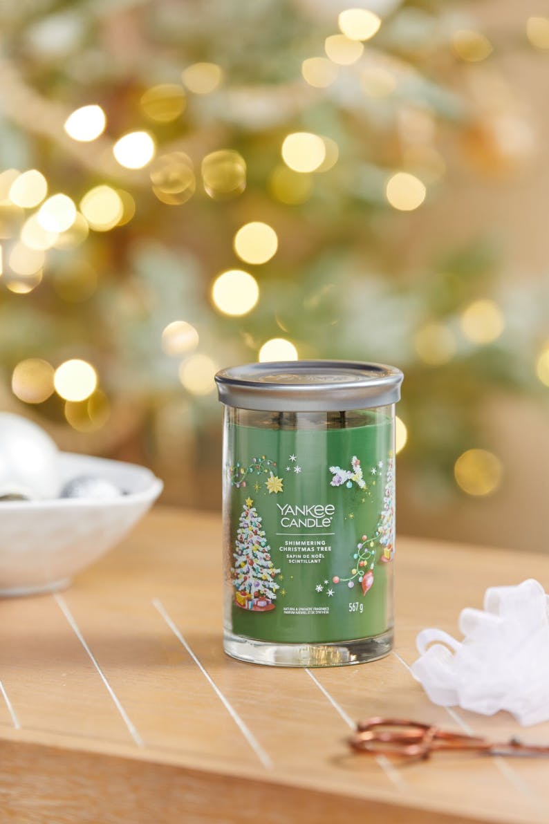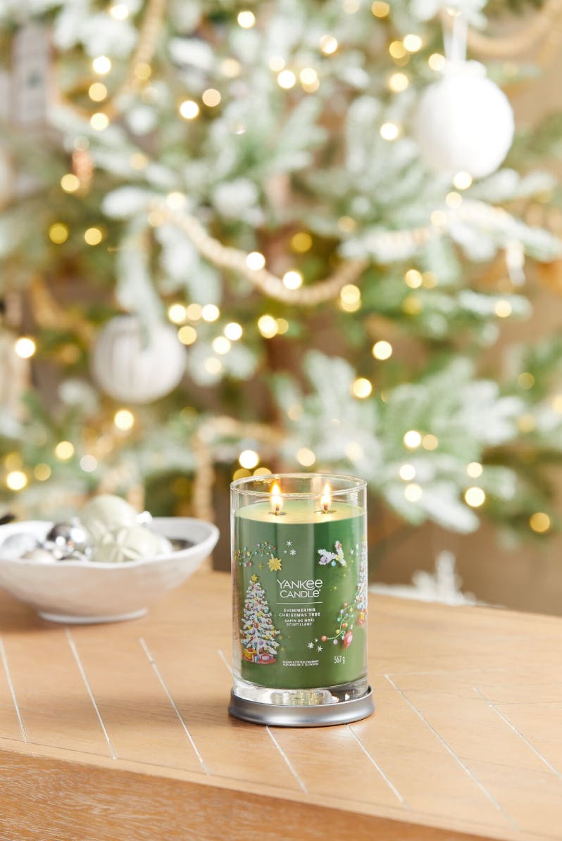 De Signature Large Candle Shimmering Christmas Tree van Yankee Candle is een prachtig vormgegeven geurkaars die de betoverende geur van een feestelijk bos naar je huis brengt.