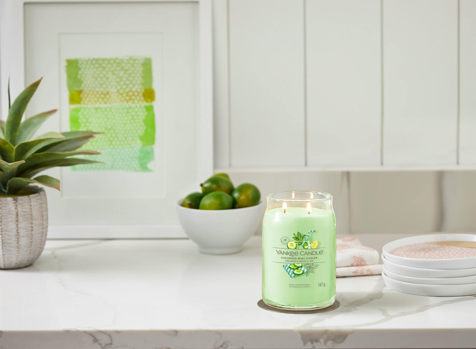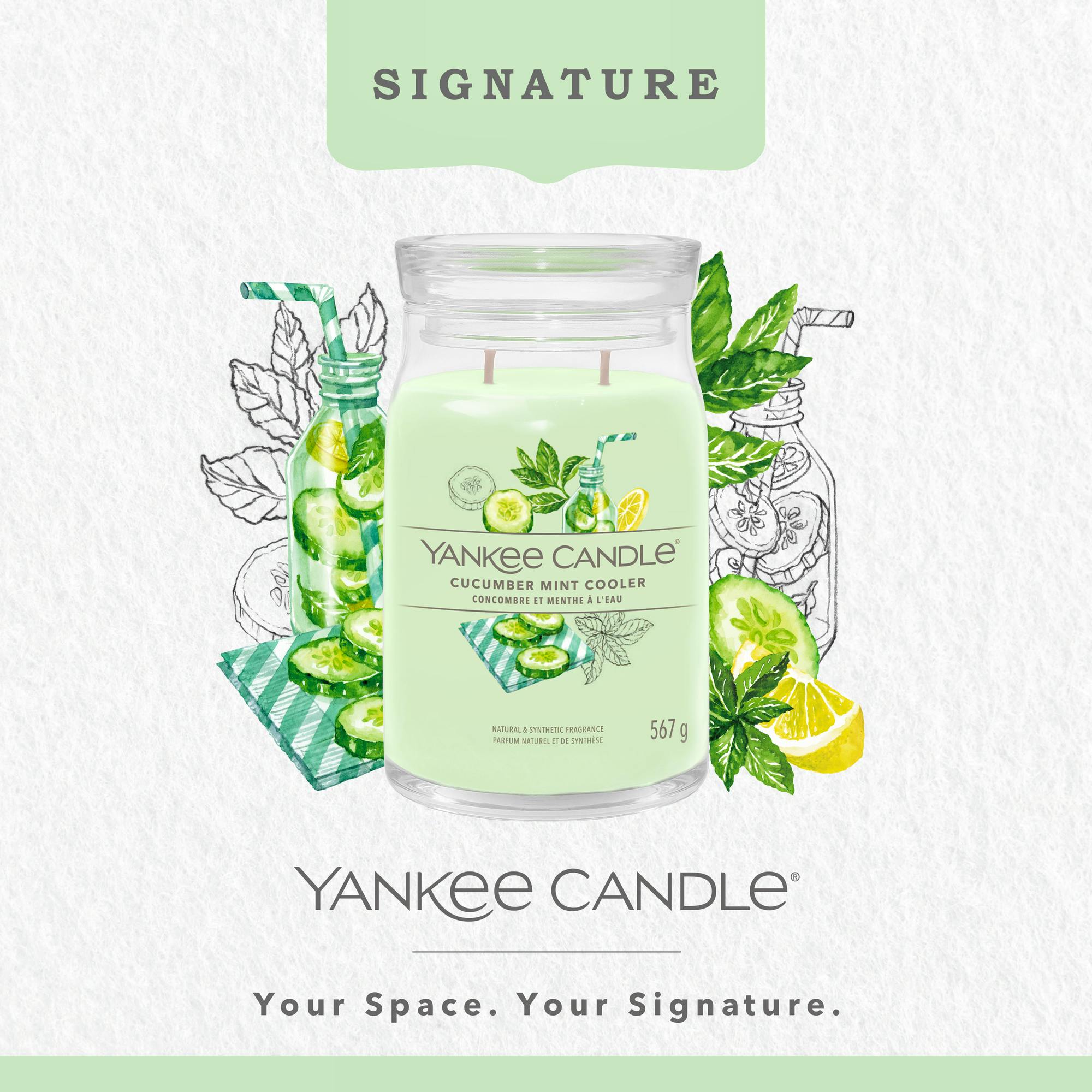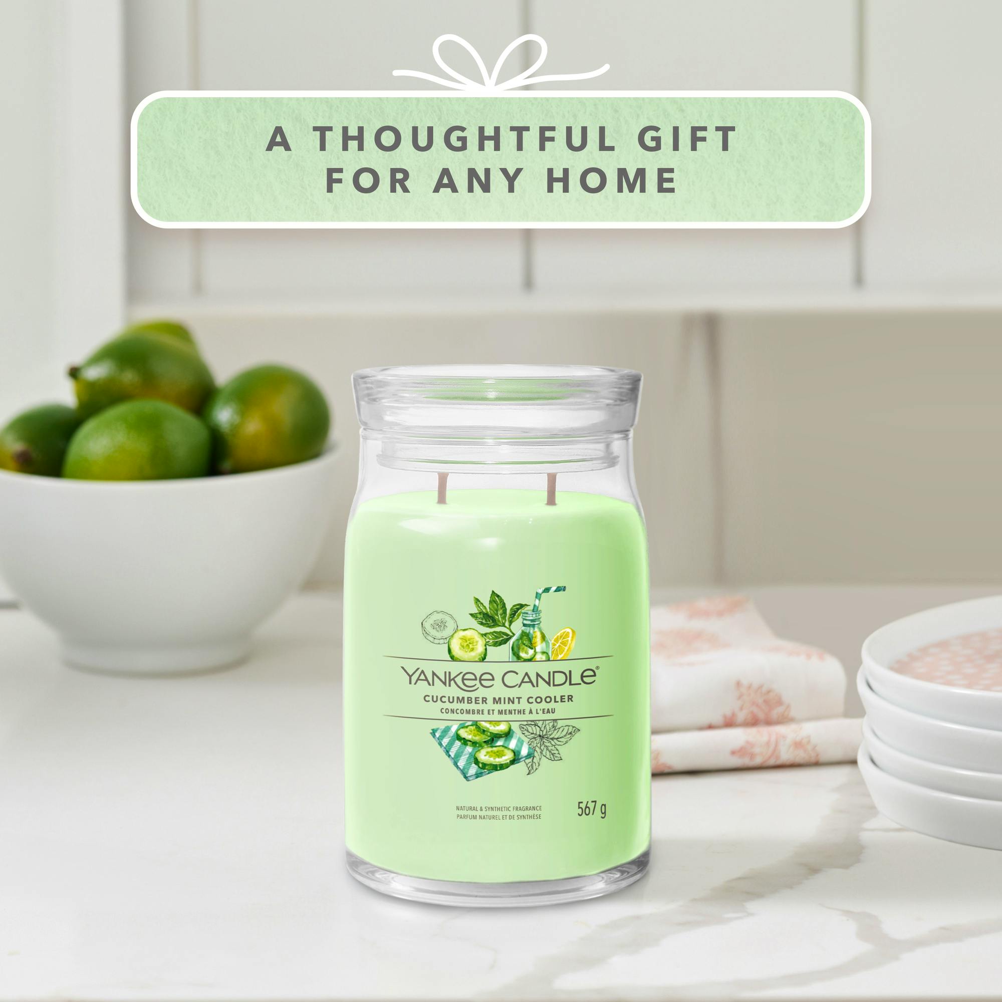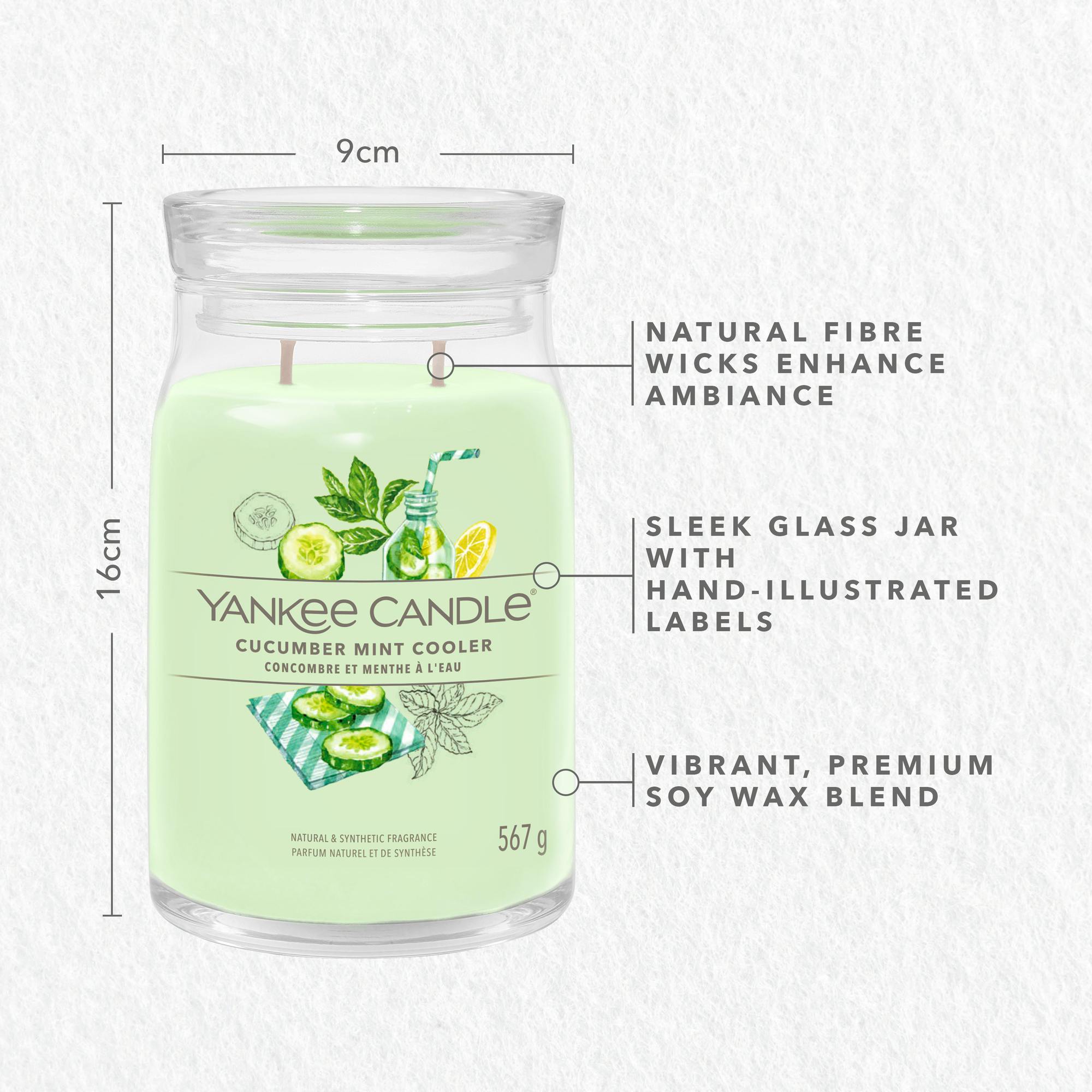 De Signature Large Jar Cucumber Mint Cooler van Yankee Candle is een geurkaars die je verwelkomt in een wereld van verfrissende en kalmerende geuren.